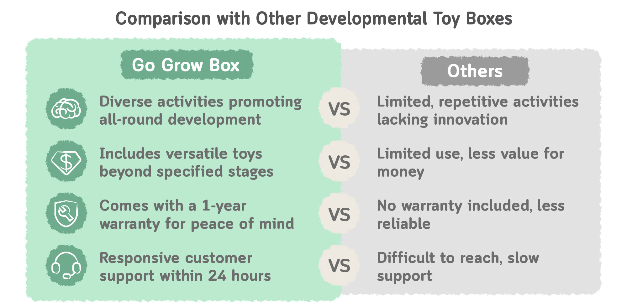 Elevate your baby's developmental journey with the Go & Grow Box for 13-15 months! Including a ball pounding bench to boost gross motor skills, washable crayons for artistic expression, a wooden box with a sliding lid for fine motor practice, and animal figurines with match cards to enhance cognitive development.