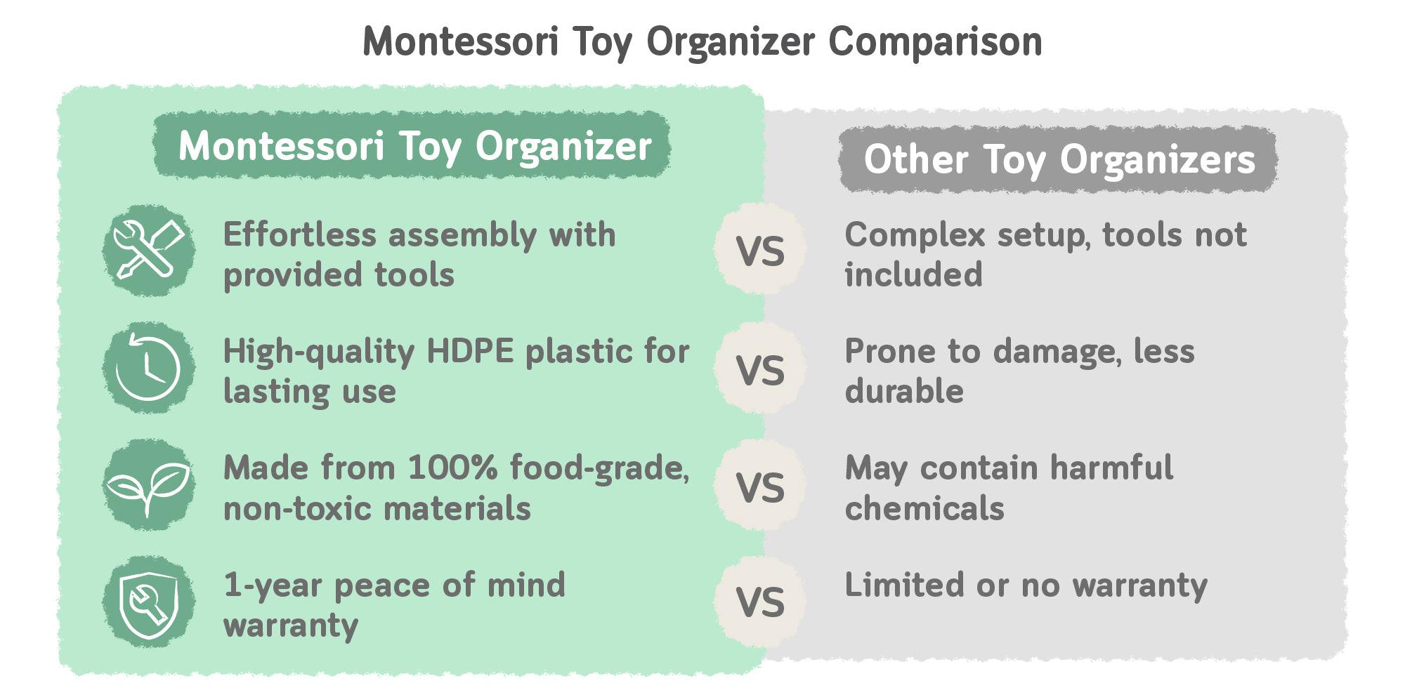It’s time to make clean-up fun with the Montessori Toy Storage Organizer! This cool organizer has plenty of bins for all your child’s toys, books, and art supplies. It’s sturdy, stylish, and super easy for kids to use, turning tidying up into a game. Keep the playroom neat and let your little one take charge of their space with this awesome storage solution!